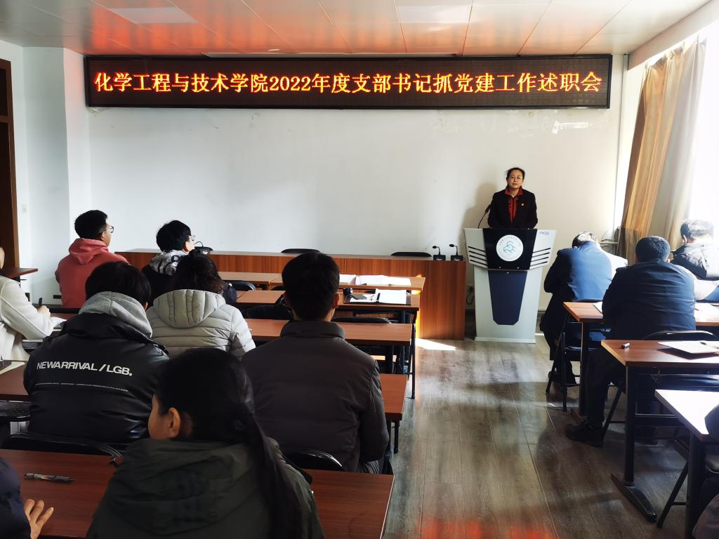 为落实新时代党建工作总要求,推进全面从严治党向基层延伸,进一步提升党支部战斗堡垒作用,2月22日下午,化学工程与技术学院2022年度支部书记抓党建工作述职会在化工馆三楼会议室召开。院党委委员、班子成员、支部书记、三办主任、工会主席及党员群众代表等参加了会议,党委书记张琤主持会议并讲话。
