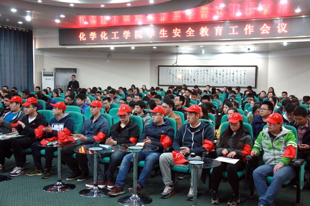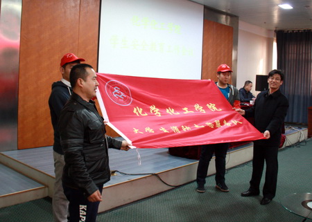 院长董晋湘教授首先作了安全工作动员,并对学院新的实验室安全规则做了重点解读。他强调大学生要牢固树立责任意识、风险意识和安全意识,要求大家时刻注意实验室安全,做好安全预防工作。闫怡红副院长对近期学院发生的两起安全事件进行了通报,并由事件责任人牟文涛同学作出检查,深刻反省事件背后安全意识淡薄的根源。校保卫处关宏站科长做了消防知识讲座,通过列举实例,提出实际的工作方法,要求学生们树立良好的责任意识和安全意识。最后,来志斌书记讲话,要求同学们一定从思想上重视并切实加强实验室安全,从制度和规范入手,严格执行,营造安全的良好的学习实验环境。会上,来志斌书记和关宏站科长为化学化工学院大学生消防志愿服务队进行了授旗仪式,消防志愿者代表宣读了实验室消防安全倡议书,倡导大家时刻谨记实验室安全问题,做好安全预防工作。