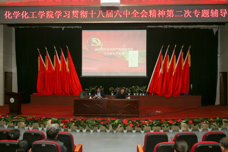 5月9日下午,学院党委在博学馆二层会议室举办学习贯彻党的十八届六中全会精神第二次专题讲座,我校纪委书记翟健教授应邀为金年金官网全体党员、干部作了题为《国际国内党内的严峻挑战形式与全面从严治党》的专题辅导报告。学院全体党员及各系(部)、中心、所负责人参加学习培训,学院党委书记来志斌主持会议。