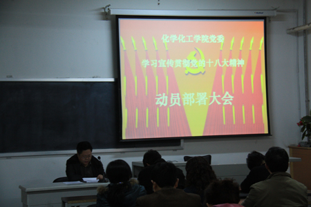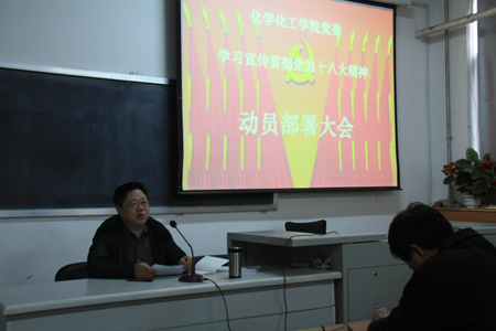为做好党的十八大精神学习贯彻落实工作,11月22日下午,学院党委召开了学习宣传贯彻落实党的十八大精神动员部署会。全体党委委员、各支部书记以及理论学习中心组成员参加了会议。院党委负责人作了动员讲话。