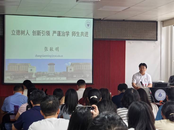 在全党深入贯彻中央八项规定精神学习教育之际,为深入学习领会习近平总书记关于加强党的作风建设的重要论述,贯彻落实中共山西省委相关文件精神,5月21日下午,校党委常委、副校长张献明教授以“立德树人 创新引领 严谨治学 师生共进”为题,在化工馆三层会议室为师生讲授专题党课。学院班子成员、各系所中心负责人、党支部书记、工会负责人、专职组织员及化工第三研究生党支部全体学生党员现场聆听了党课。