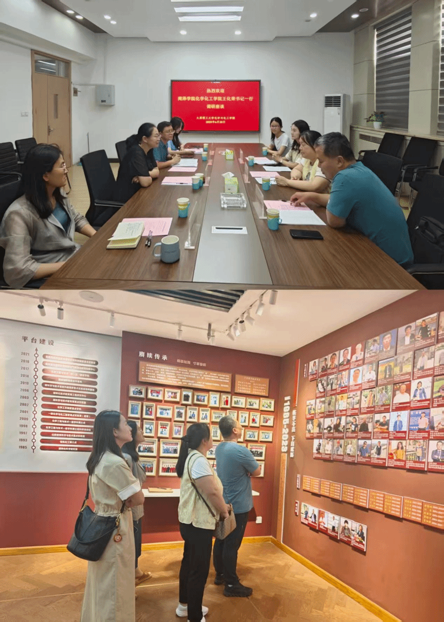 王化荣对金年金官网的热情接待表示感谢,高度评价金年金官网在党建、教学科研、学生管理等方面的突出成效,并介绍了菏泽学院化学化工学院整体情况和办学特色。交流座谈中,双方重点围绕考研指导与就业服务进行深入交流、分享经验做法。会后,王化荣一行实地考察了谢克昌院士工作室、学院文化墙及国家虚拟仿真实验室等场所,通过现场观摩和细致交流,了解了学院悠久的办学历史、深厚的文化底蕴以及前沿的科研创新成果。