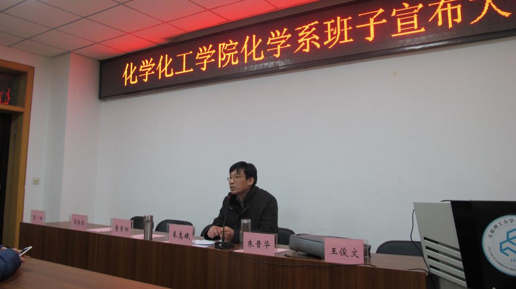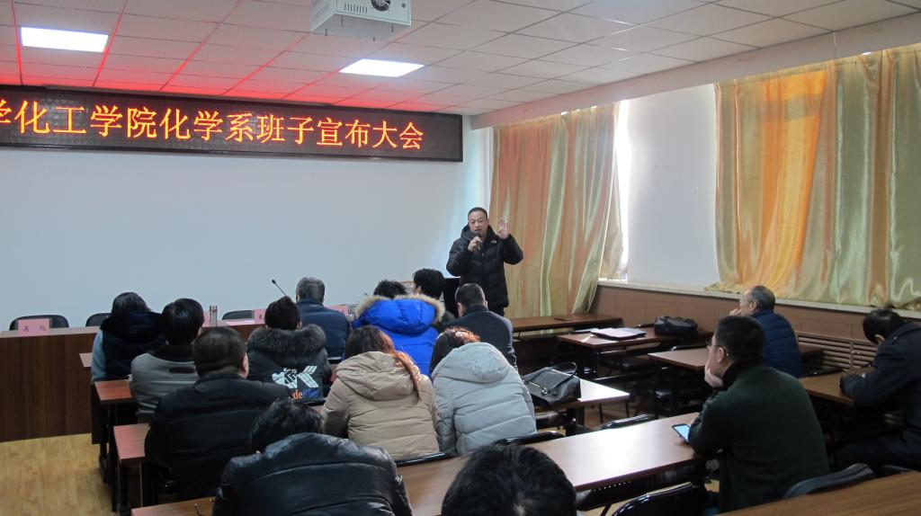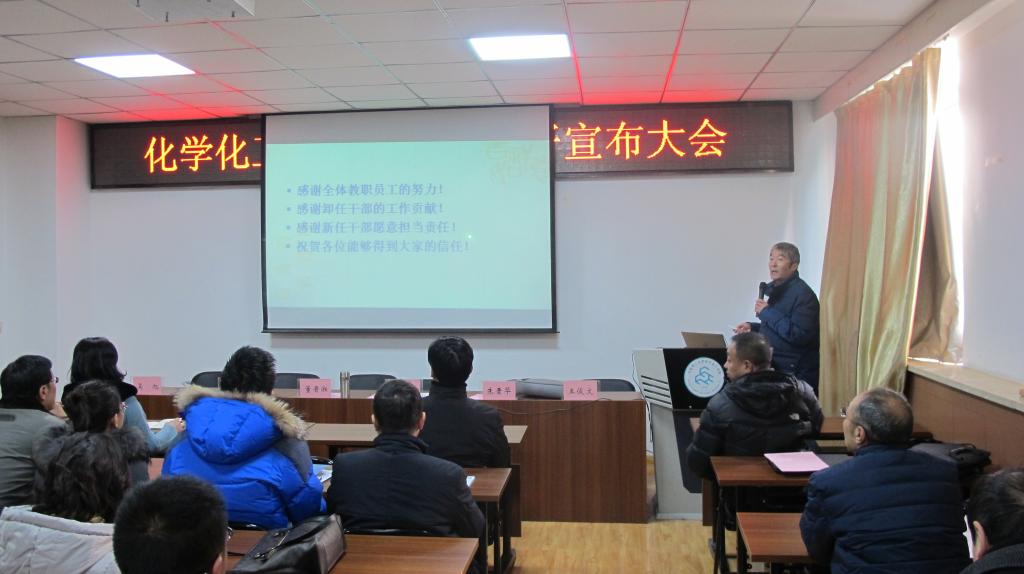 2018年12月29日、2019年1月2日上午,化学化工学院党委在学院三层会议室分别召开了化学系、精细所,化工系、过控系负责人宣布大会,全体院领导、各系(所、中心)全体教师参加会议,会议由院党委书记来志斌主持。