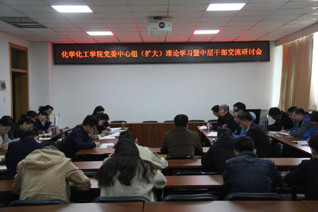 3月21日下午,金年金官网在化工馆三层会议室召开院党委中心组(扩大)理论学习暨中层干部交流研讨会。学院党委所属全体处级干部、党委委员、支部书记、各系(中心、所)主任、三办主任、团委书记、工会主席、教师代表、学生代表参加了会议。会议由学院党委书记来志斌主持。