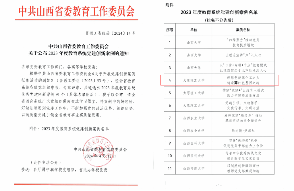 近日,山西省2023年度教育系统党建创新案例评选结果公布,金年金官网党建案例《燃绿色能源化工之火 铸栾茀红色基因之魂》入选山西省2023年度教育系统党建创新案例。