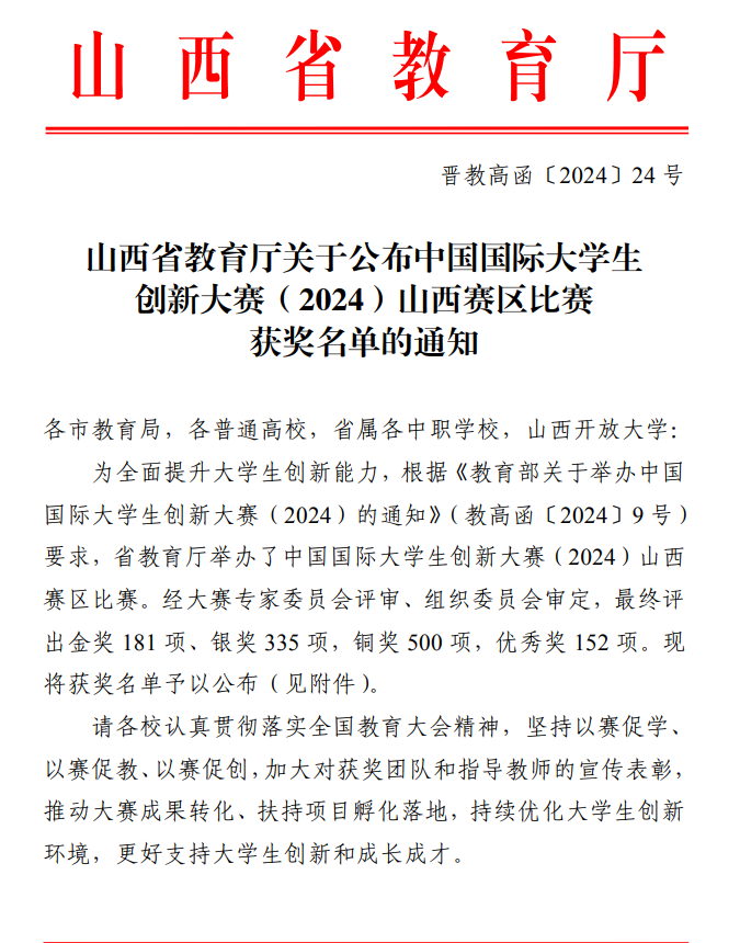 近日,山西省教育厅公布了中国国际大学生创新大赛(2024)山西赛区比赛获奖名单,金年金官网师生在众多参赛队伍中脱颖而出,喜获佳绩。