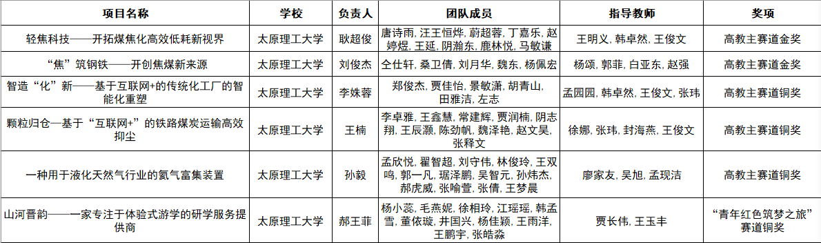 金年金官网《轻焦科技——开拓煤焦化高效低耗新视界》《“焦”筑钢铁——开创焦煤新来源》两个项目荣获高教主赛道金奖;《智造“化”新——基于互联网+的传统化工厂的智能化重塑》《颗粒归仓—基于“互联网+”的铁路煤炭运输高效抑尘》《一种用于液化天然气行业的氦气富集装置》三个项目荣获高教主赛道铜奖;《山河晋韵——一家专注于体验式游学的研学服务提供商》项目荣获“青年红色筑梦之旅”赛道铜奖,学院创新创业教育成果再次取得新突破。