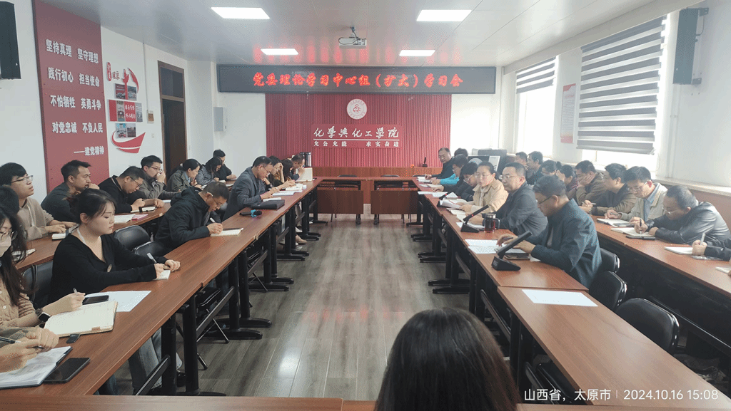 10月16日下午,院党委在化工馆三层会议室召开党委理论学习中心组(扩大)学习会,学院党委理论学习中心组成员、各党支部书记、各部门相关负责人参加会议,会议由党委书记张琤主持。